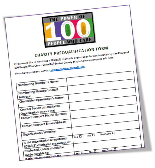 To nominate and pitch for a local non-profit at one of our meetings, you must be a committed member (i.e., have completed the Commitment Form, made your first quarterly donation, and be up-to-date in your quarterly donations). At each meeting, committed members who want to make a pitch put their names in a hat and three are randomly drawn. Note: Local means that the non-profit serves communities in Benton County (though they may also serve adjacent counties).